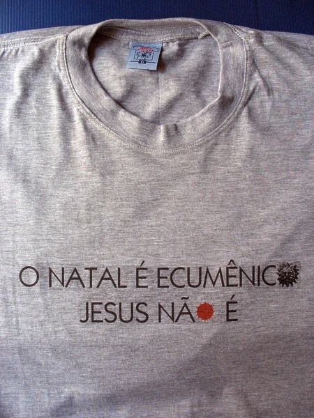 A camiseta foi desenvolvida inicialmente em 2012, e para ser confeccionada pelo método de estêncil. Porém, acabei estampando-a pelo processo transfer (fotos acima). E logo vi que ficava algum vestígio da película aplicada, e que era visível. Principalmente nas cores escuras, como na estampa abaixo (“O Natal é ecumênico. Jesus não é”), aonde percebe-se uma sombra escura na arte.