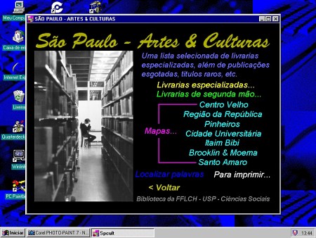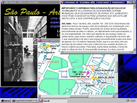 São Paulo - Artes & Culturas é um aplicativo desenvolvido em 1998, para ser instalado no computador, e que cabe em um disquete de 1,44 MB na época (aquele de 3,5 polegadas). Nele estão contidas as duas listas de endereços: Livrarias especializadas, e sebos (alfarrábiois) da Grande São Paulo. Além das listas, 7 mapas a saber: Centro Velho de São Paulo, Região da República, Região de Pinheiros, Itaim Bibi, Brooklin e Moema, Zona Sul e a Cidade Universitária. E também, tem um portal de conteúdo, com uma lista selecionada de links, para acessar a Internet.