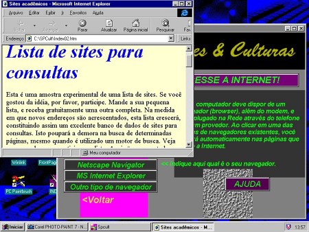 Logo, as páginas que montei são as mais simples. Inicialmente foi com o Microsoft Front Page, e que vinha junto ao Windows 95. Mais tarde, preferi trabalhar com os editores que mexem diretamente nos códigos, para ter o maior controle.